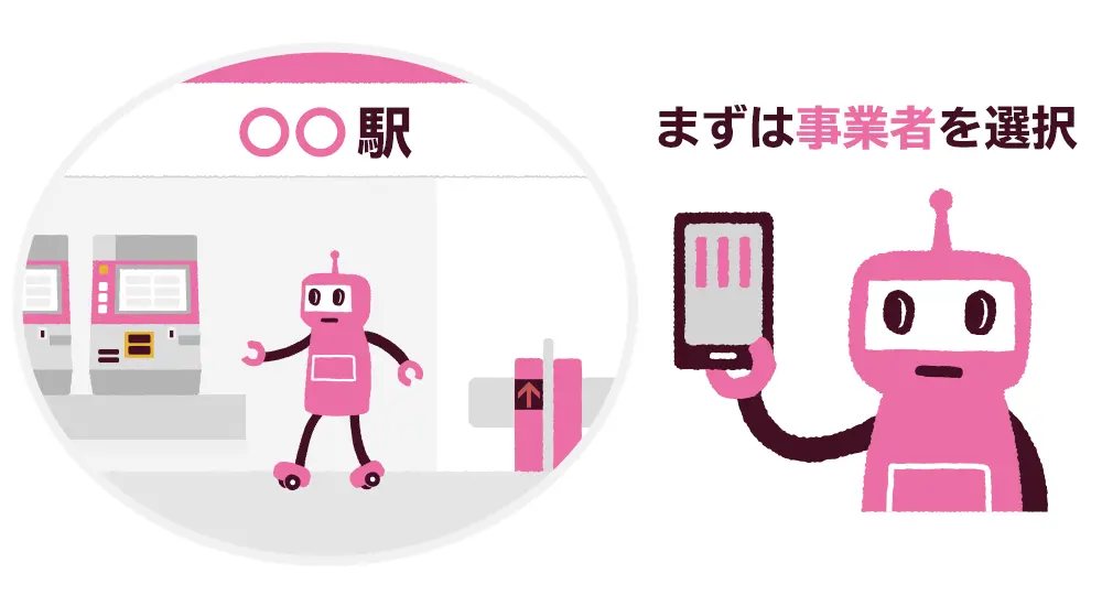カードタイプの定期を購入する場合と同様に、購入する定期券の乗車駅となる事業者をお選びいただいてから、乗車駅、降車駅をご指定ください。